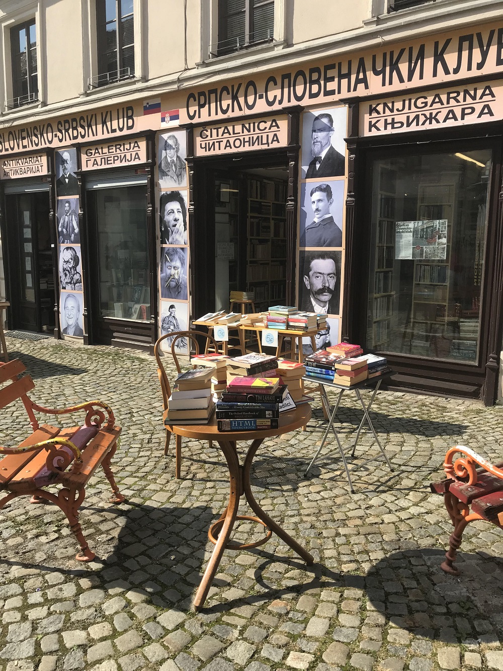 Antikvarijat i knjižara Slovensko srbski klub u kojem se može udobno sjediti, prelistavati knjige i naravno kupiti mnoge dobre naslove. Knjižara ima oko 18.000 različitih knjiga. Cijene knjiga su od 3 do 30 Eura.
