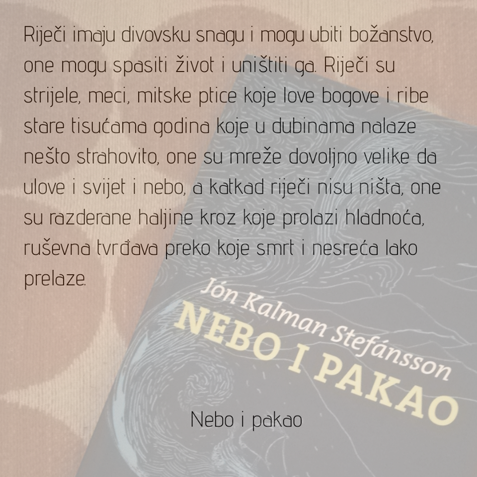Kakav je ovo roman? Sjajan! Bilo je naravno romana o moru poput "Moby Dicka" ili one priče o starom ribaru i njegovom marlinu i svaki je od njih imao svoj jezik – i Melville i Hemingway su majstori. Pisali su o moru i ljudima uz more i Defoe, Golding, Conrad, Steinbeck, Jules Verne, R. L. Stevenson, Thor Heyerdahl i Virginia Woolf i pisali su o plovidbama, morima i oceanima, svjetionicima. Ali ovo je sasvim poseban roman o moru, mirniji, usporeniji, roman o dječaku, odrastanju, ribarskom životu, želji da se učini više, da se drugačije živi, ali i životu ljudi koji su vezani uz to beskrajno plavetnilo koje daje i uzima. Nema velikog zapleta, ali ima velikih rečenica. Nema strašnih prevrata, ali ima strašne tišine, one u kojoj čujemo otkucaje naših srdaca i šumove naših duša. Roman je ovo kojeg čitamo s kočnicama jer se ne želimo od njega rastati. Čarobno je pisanje Jóna Kalmana, ritam knjige ne čine ludi zapleti već riječi koje nakon čitanja još dugo odzvanjaju. To je jednostavno jedna od onih (rijetkih) knjiga koja u vama ostavi mnogo više nego li ste očekivali. Jer, islandska svjetlost može proći kroz tebe i pretvoriti te u pjesnika što možda i nije uvijek dobra stvar. Dječak je u neku ruku prisilno ribar. Želi postići nešto u životu, naučiti jezike, vidjeti svijeta, pročitati tisuću knjiga, želi otkriti, putovati.. ali teško je maštati pa čak i planirati kad je dan omeđen morem i ribarenjem, teško je misliti i čitati kad si umoran od veslanja i hladnoće. Dječak i njegov prijatelj Bárður vraćaju se u ribarsku kolibu i s drugovima po veslu i udici čekaju da se vrijeme smiri pa da mogu s isploviti. Bárður ima nešto dragocjeno - knjigu. Vrijeme između ribarenja krati čitajući stari islandski prijevod Miltonovog "Izgubljenog raja" jer „nama možda nisu potrebne riječi za preživljavanje, ali zato su nam potrebne da živimo“. I dječak voli čitati i njih su dvojica najmlađi dio ekipe, prijatelji, Barður ga je uzeo pod svoje pa je malome i stariji brat i zaštitnik i otac… Kad napokon more pušta da na njega nalegne brod sa šest pari vesala, pa satima veslaju do dobre pošte, odjednom se vrijeme promijeni i počne sniježiti. Bárður shvaća da je zaboravio kabanicu i što se u početku čini kao blesava pogreška ubrzo će baš ona biti granica između života i smrti. Možda o tome može pisati samo islandski pisac koji je radio u tvornici ribe, klaonici, u obalnoj straži, bio bibliotekar pa učitelj i na kraju novinar. Jer ono što bismo opisali kao prekrasan krajolik, što bi nam se kao turistima svidjelo ima i drugo lice. Island je ovdje zemlja bjeline i leda u kojoj nema mnogo topline, a čak su i ljubavi mehaničke i krute. Ta šačica ljudi na obali Sjevernog mora raspoređena u nekoliko ribarskih ekipa koja se bori da im se ne smrzne krv, da se ne utope, da prežive sve primaju stoički. Ako se i dogodi nesreća prihvaćaju je kao nešto najnormalnije: ribar si, padneš u more, potoneš, umreš. Takav je krug života ribara početkom stoljeća u dijelu svijeta gdje nema modernih brodica, tehnologije već samo žuljeviti dlanovi, brodice, vesla, kabanice i more. "Nebo i pakao" priča je koju čitamo i prepoznajemo, a opet nas iznenadi surovom ljepotom, razmišljanjima, glasovima predaka, likovima, opisima… to je univerzalna priča o ljudskoj krhkosti usred ogromne snage prirode, o nevjerojatnoj izdržljivosti i snazi, pa ako želite i tvrdoglavosti čovjeka da nađe svoje mjesto pod (zaleđenim) suncem čak i na mjestima koja nisu za normalan život. Priča o prijateljstvu, preživljavanju bezvremenska je i nježna, potresna i jednostavno lijepa i svakako zaslužuje svu vašu pažnju (i tople dlanove).